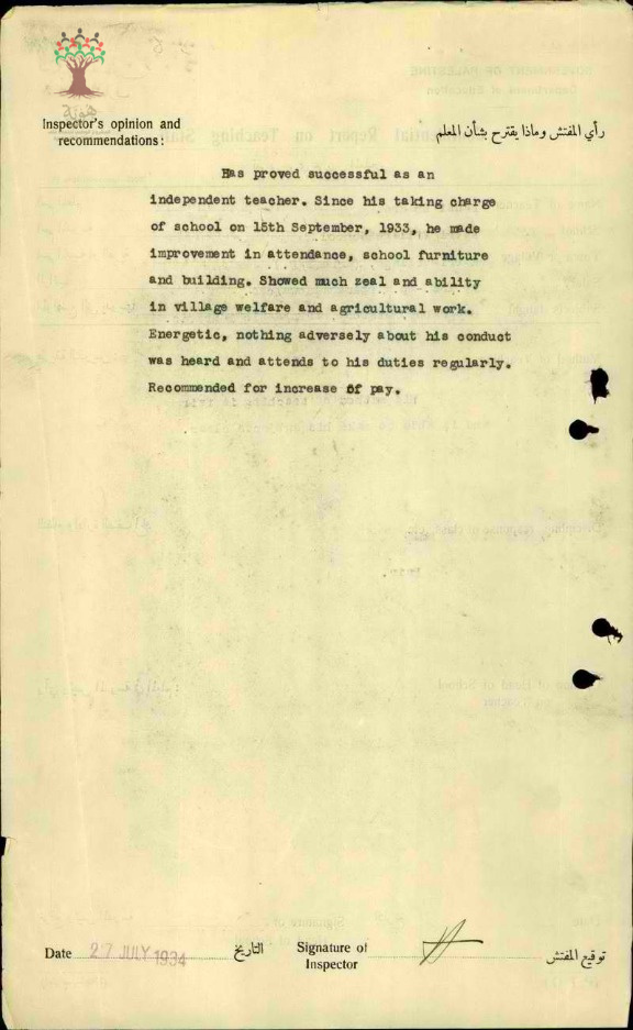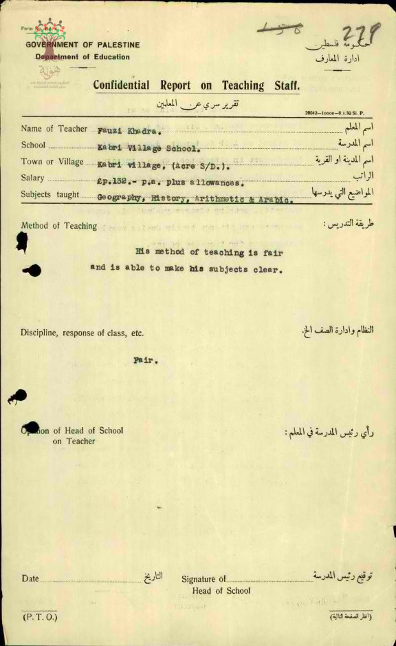 تقرير تفصيلي عن أداء المعلم فوزي محمد الخضرا في مدرسة الكابري سنة 1934