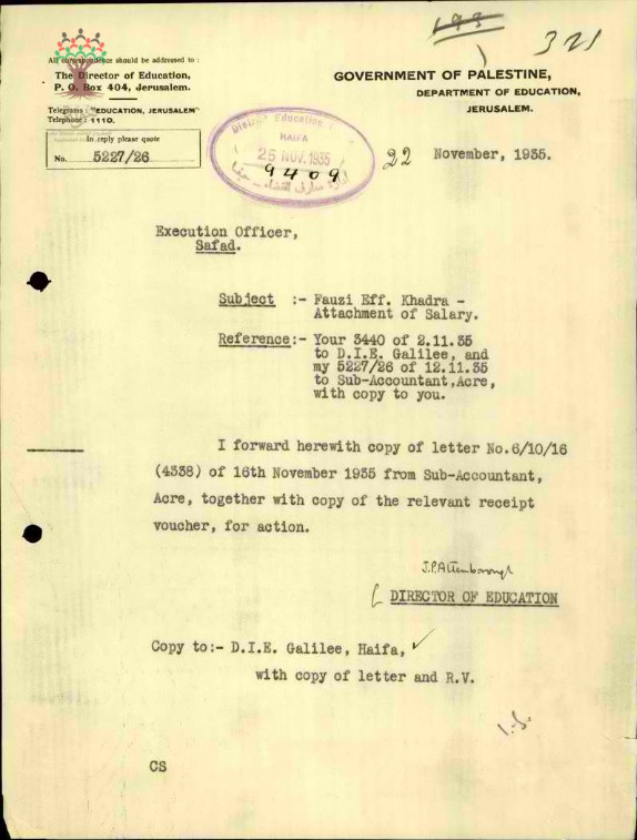 رسالة من مدير المعارف الى الضابط التنفيذي بخصوص الخصم من راتب المعلم فوزي الخضرا