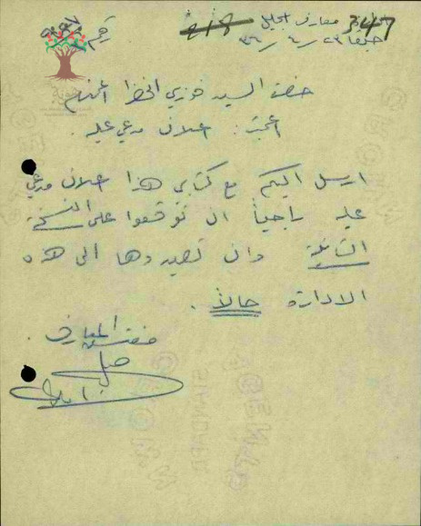 رسالة من مفتش المعارف الى المعلم فوزي الخضرا للتوقيع على نسخة اعلان المدعي العام