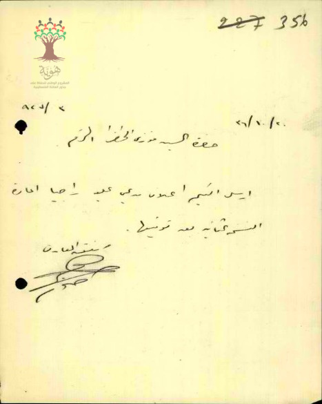 رسالة من مفتش المعارف الى المعلم فوزي الخضرا للتوقيع على نسخة اعلان المدعي العام