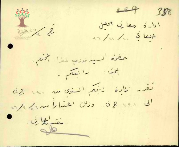 رسالة من مفتش المعارف الى المعلم فوزي الخضرا بخصوص زيادة راتبه السنوية