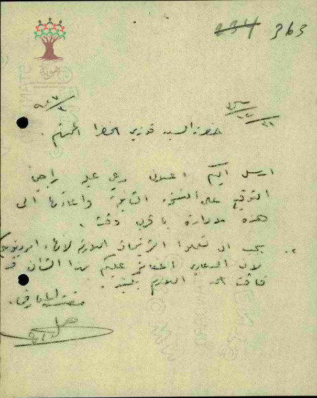 رسالة من مفتش المعارف الى المعلم فوزي الخضرا للتوقيع على نسخة اعلان المدعي العام
