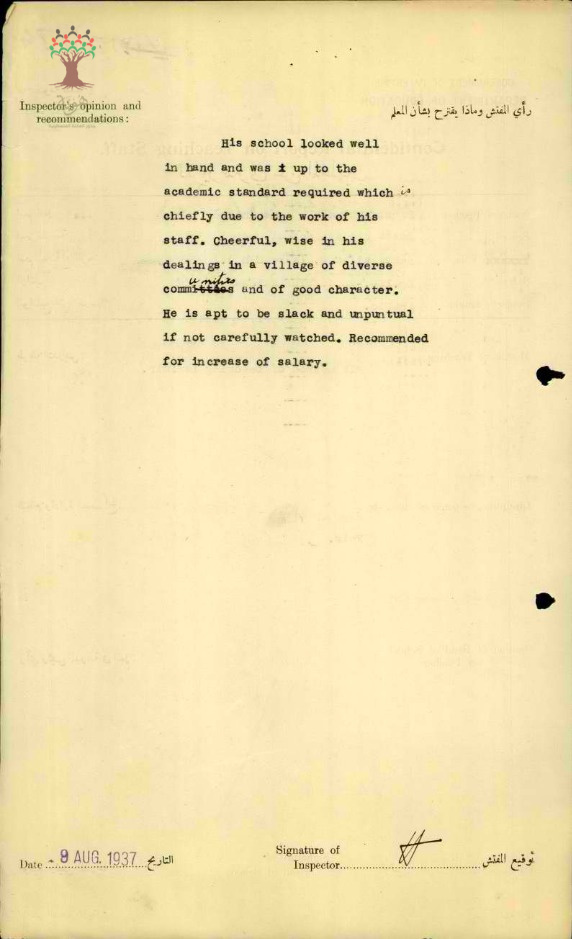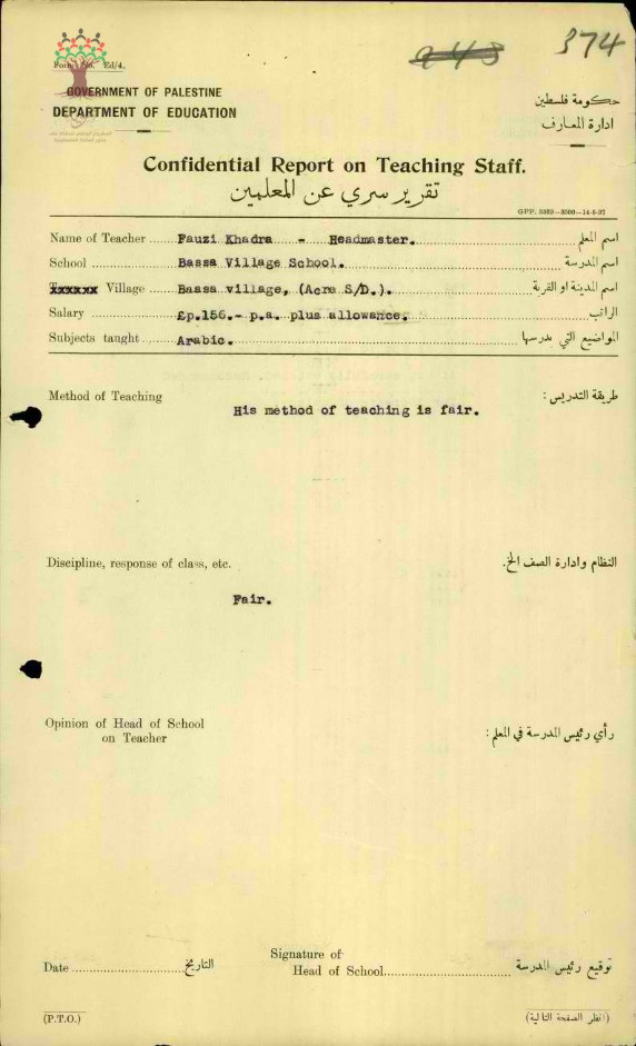 تقرير تفصيلي عن أداء المعلم فوزي محمد الخضرا في مدرسة البصة سنة 1937