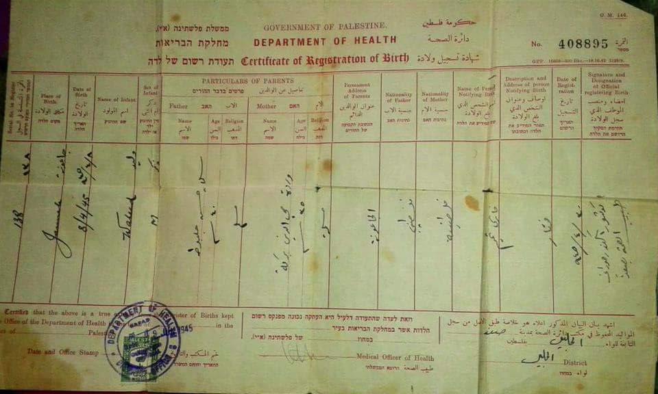 شهادة تسجيل ولادة وليد جلبوط في الجاعونة - 1945