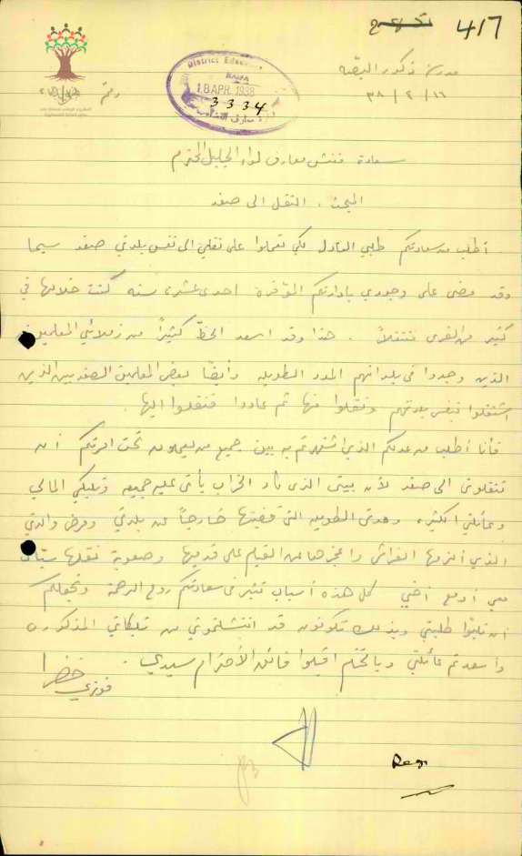رسالة من المعلم فوزي الخضرا الى مفتش المعارف يطلب فيها نقله من البصة الى صفد