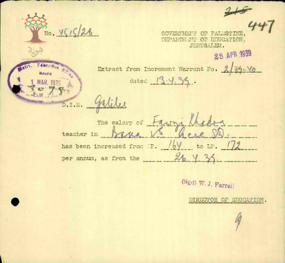 رسالة من مدير المعارف الى مفتش المعارف بخصوص زيادة راتب المعلم فوزي الخضرا السنوية