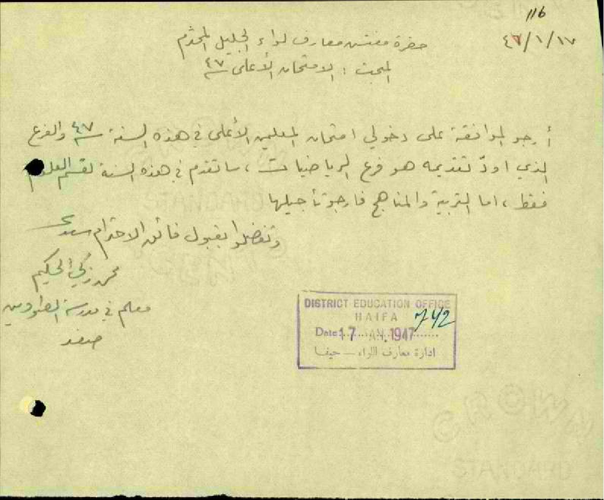 رسالة من مدرسة الصواوين صفد إلى مفتش المعارف الميحث إمتحان المعلمين لسنة 1947