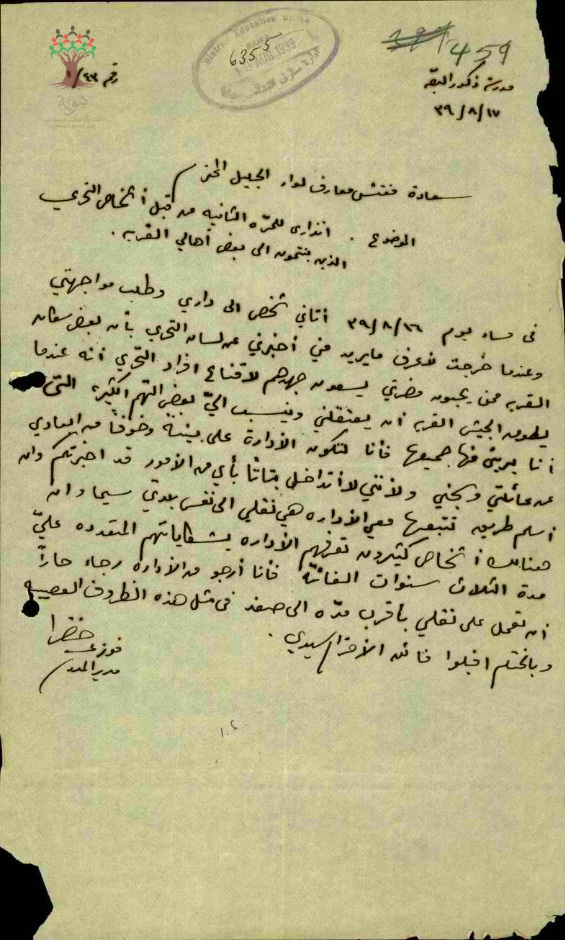 رسائل من المعلم فوزي الخضرا الى مفتش المعارف بخصوص انذارين موجهين اليه من اشخاص التحري
