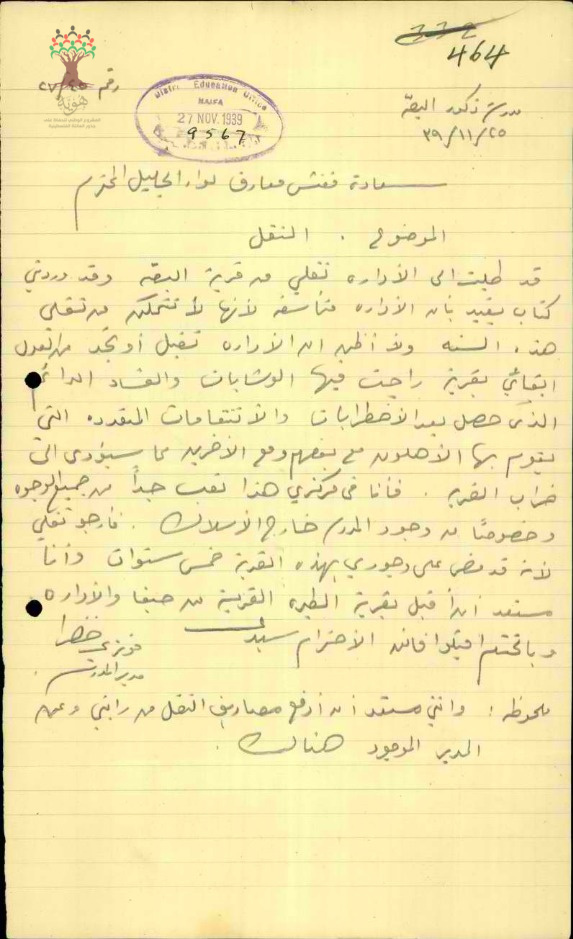رسالة من المعلم فوزي الخضرا الى مفتش المعارف يطلب فيها نقله