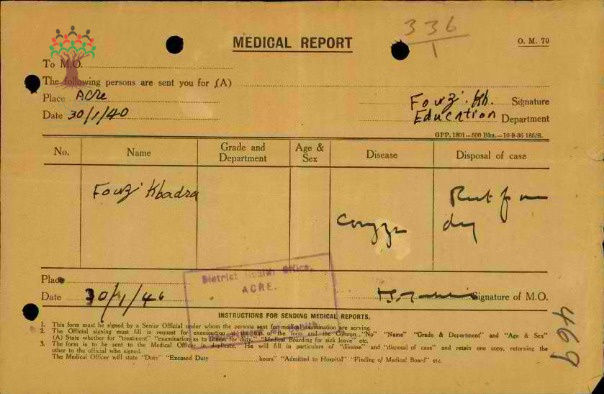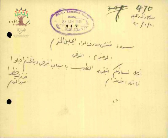 رسالة من المعلم فوزي الخضرا الى مفتش المعارف بخصوص تغيبه عن العمل مرفقة بالتقرير الطبي