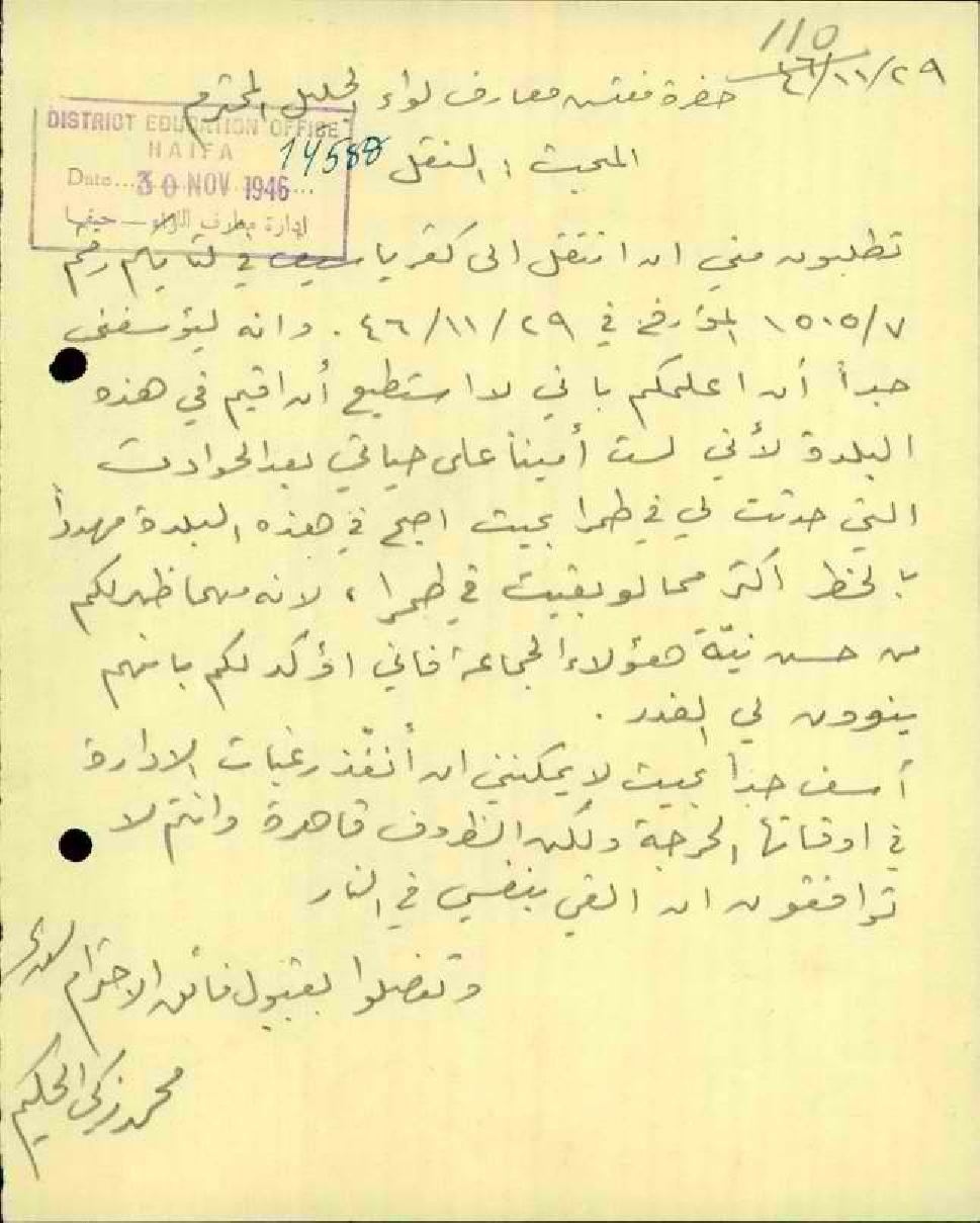 رسالة من المعلم محمد زكي الحكيم إلى مفتش المعارف - أرفض النقل لأنني لا أستطيع أن أعيش بكفر ياسيف بعد ماجرا لي بقرية طمرا ولا أمينا على حياتي