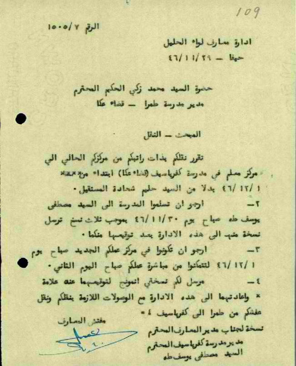 رسالة من مفتش المعارف -بخصوص النقل من مدرسة طمرا إلى مدرسة كفرياسيف بنفس راتبكم كمعلم