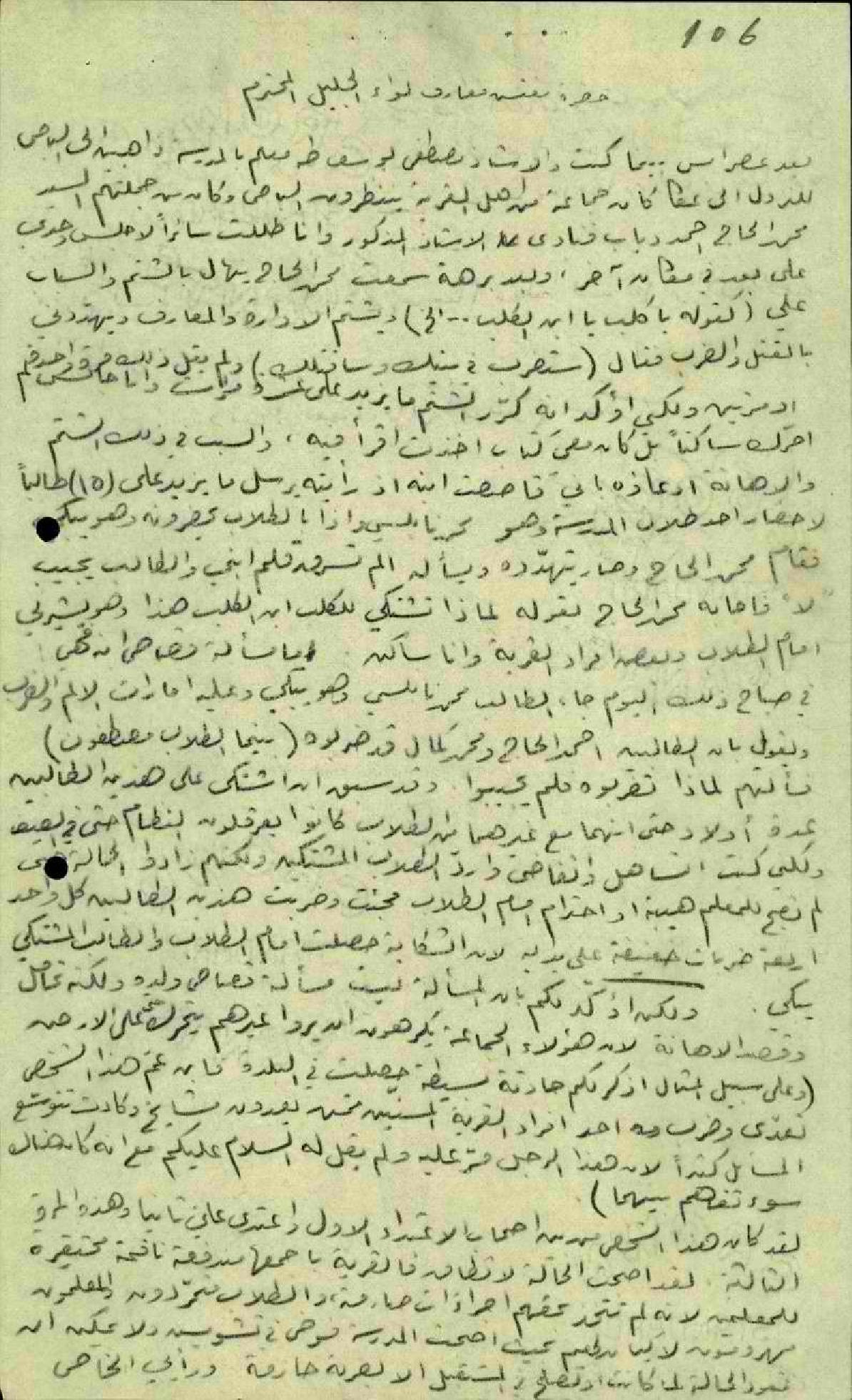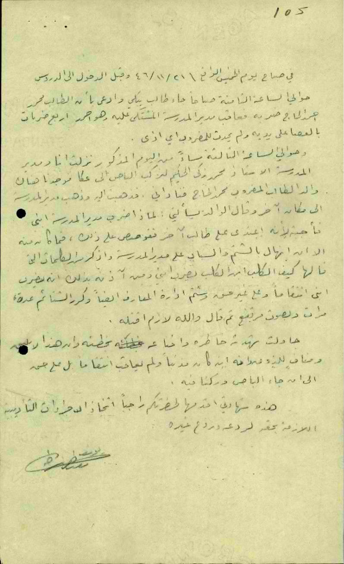 تقرير من مدير مدرسة طمرة محمد زكي الحكيم عن حادثة ضرب الطفل محمد أحمد الحاج في المدرسة وأهانة ذويه وأقربائه له