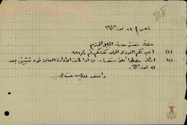 رسالة من المعلم واصف عنبتاوي الى مفتش المعارف يسأل عن تثبيته في العمل