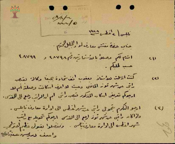 رسالة من المعلم واصف عنبتاوي الى مفتش المعارف يخبره بانه استلم استمارته السنوية ويطلب تحويل راتبه