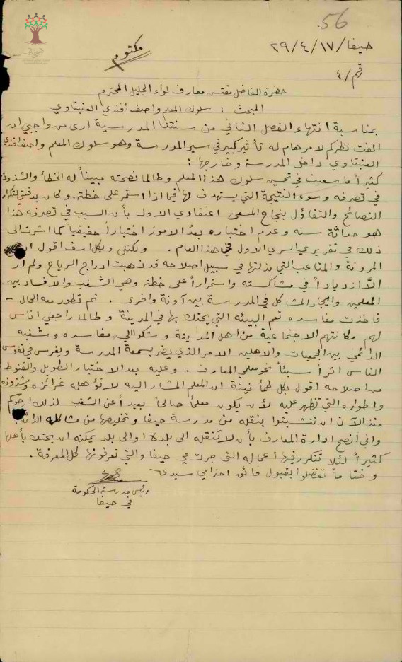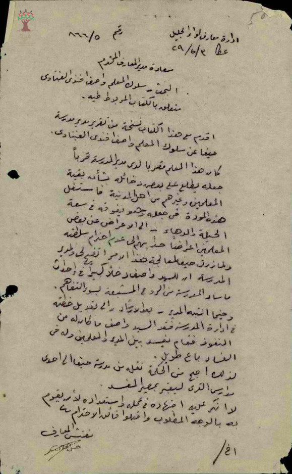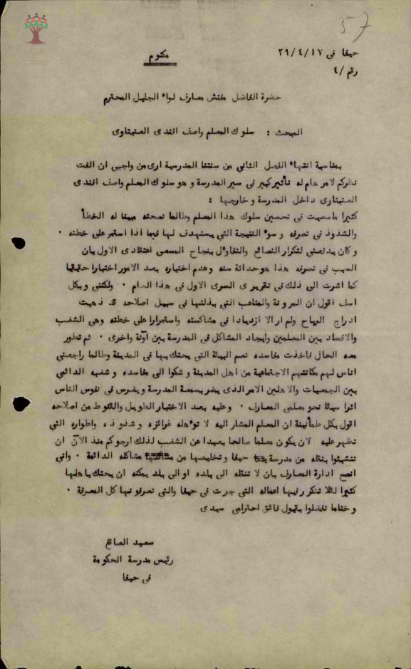 رسائل بخصوص سلوك المعلم واصف عنبتاوي في مدرسة الحكومة في حيفا