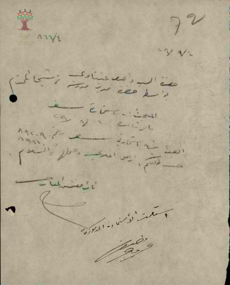 رسالة من مفتش المعارف الى المعلم واصف عنبتاوي بخصوص استمارة سفره