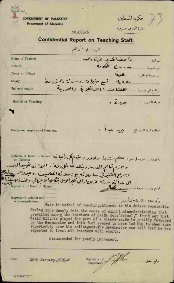 تقرير تفصيلي عن أداء المعلم واصف عنبتاوي في مدرسة حيفا للذكور سنة 1928