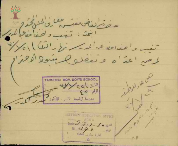 رسالة من مدير مدرسة ترشيحا الى مفتش المعارف بخصوص تغيب المعلم واصف عنبتاوي
