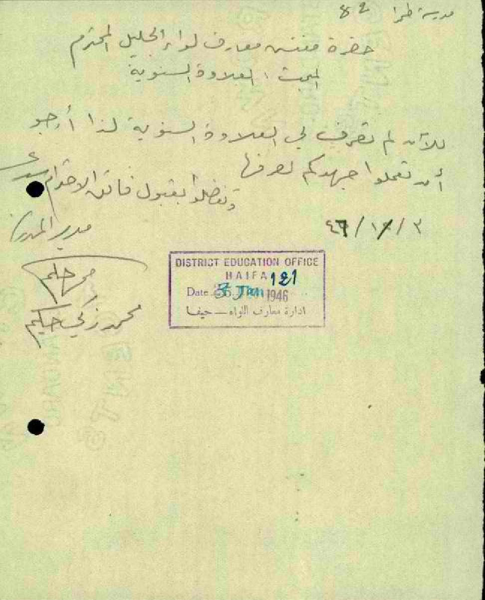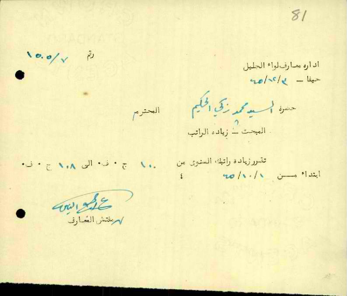 رسالة من مدير مدرسة طمرا إلى مفتش معارف الجليل - المبحث العلاوة السنوية