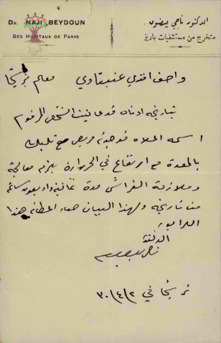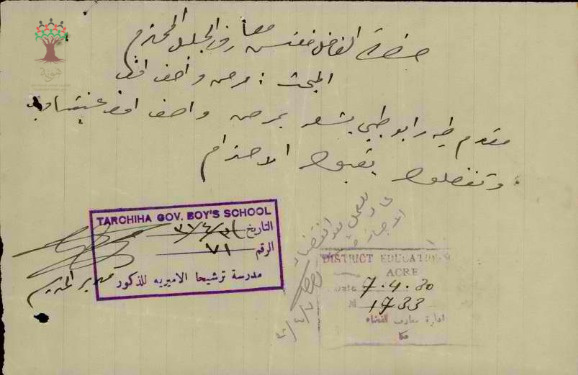 رسالة من مدير مدرسة ترشيحا الى مفتش المعارف بخصوص تغيب المعلم واصف عنبتاوي مرفقة بالتقرير الطبي