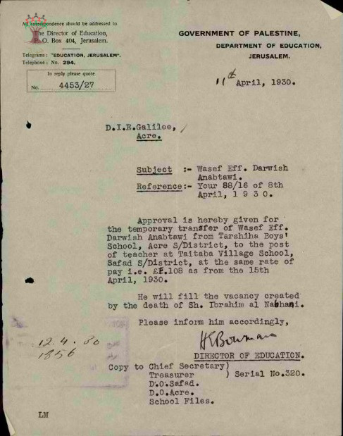 رسالة من مدير المعارف الى مفتش المعارف بخصوص نقل المعلم واصف عنبتاوي من مدرسة ترشيحا الى مدرسة طيطبا