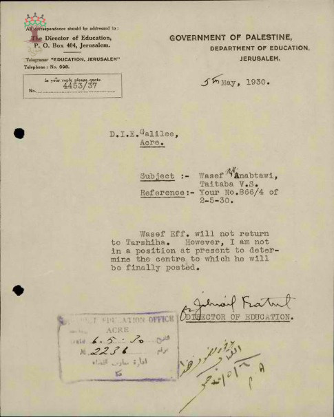 مجموعة رسائل بخصوص عدم امكانية اعادة المعلم واصف عنبتاوي الى مدرسة طيطبا
