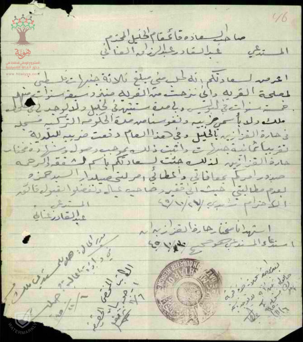 عبدالقادر يطلب اعفاءه من الضريبة في حلحول لأنه يدفع في الخليل ويشهد على ذلك مختار حارة القزازين في الخليل