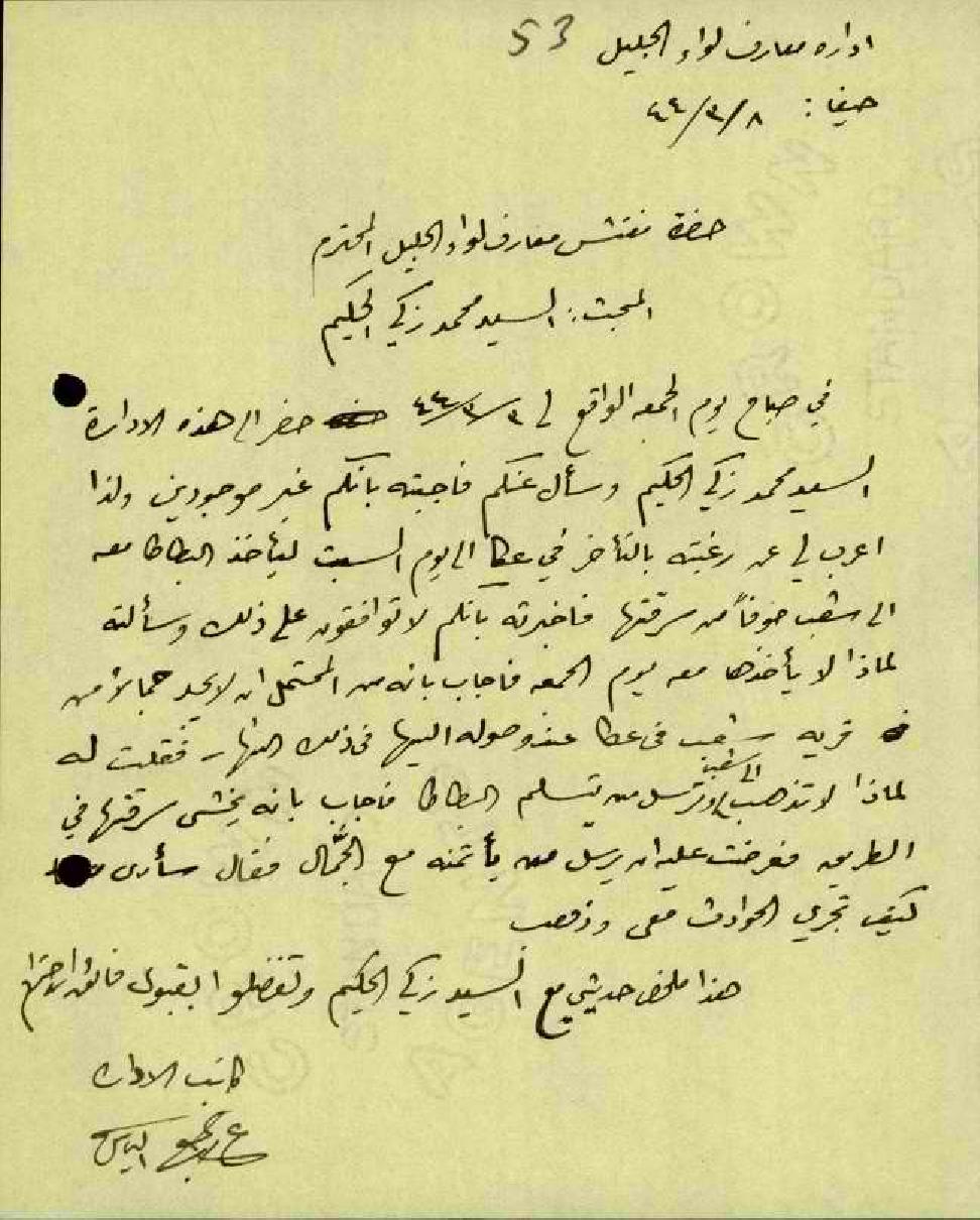 رسالة ن كاتب الأذان إلى مفتش معارف لواء الجليل-المبحث السيد أحمد زكي الحكيم