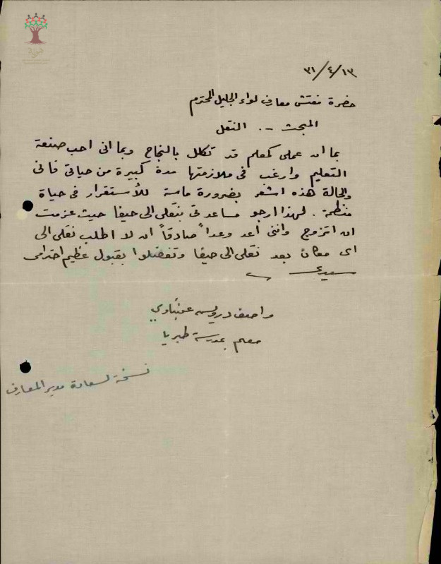رسالة من المعلم واصف عنبتاوي الى مفتش المعارف يطلب فيها نقله الى حيفا