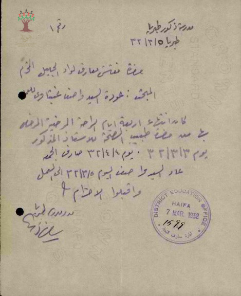 رسالة من مدير مدرسة طبريا الى مفتش المعارف بخصوص عودة المعلم واصف عنبتاوي الى العمل