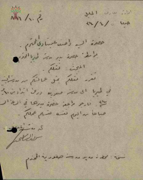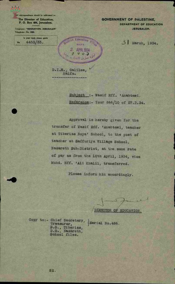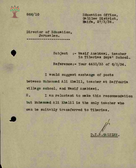 مجموعة رسائل بخصوص نقل المعلم واصف عنبتاوي من مدرسة طبريا الى مدرسة صفورية