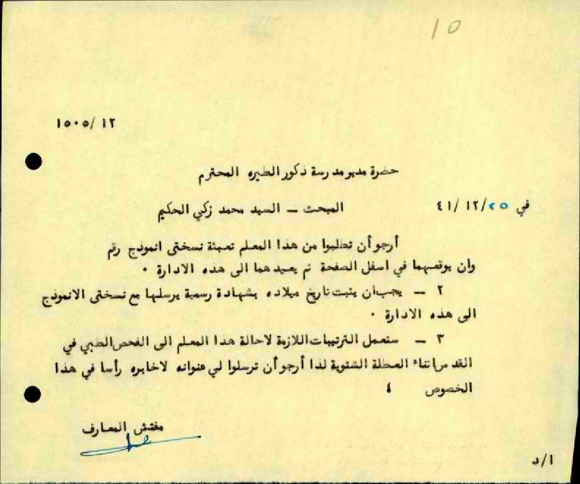 رسالة من مفتش معارف لواء الجليل - إلى حضرة مدير مدرسة الطيرة المحترم المبحث المعلم محمد زكي الحكيم -