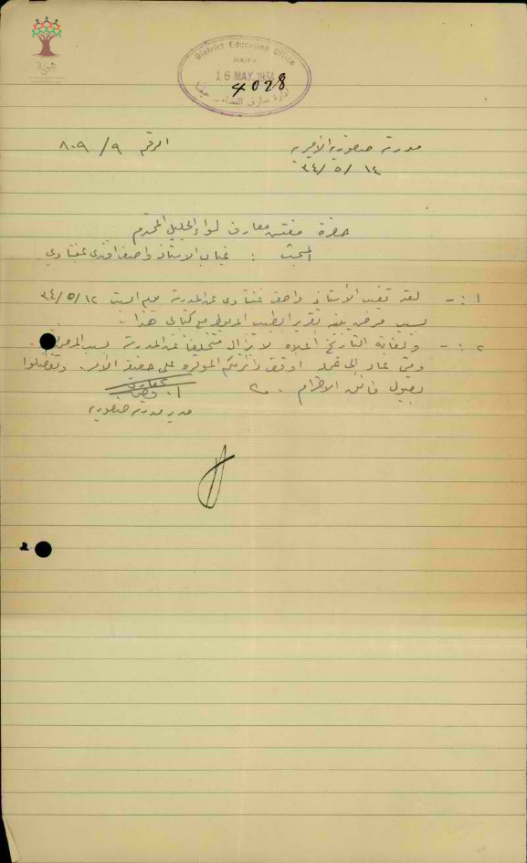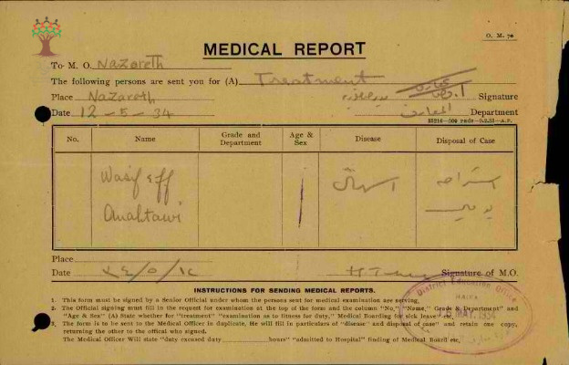 رسالة من مدير مدرسة صفورية الى مفتش المعارف بخصوص تغيب المعلم واصف عنبتاوي مرفقة بالتقرير الطبي