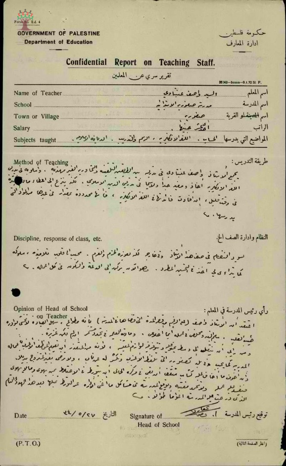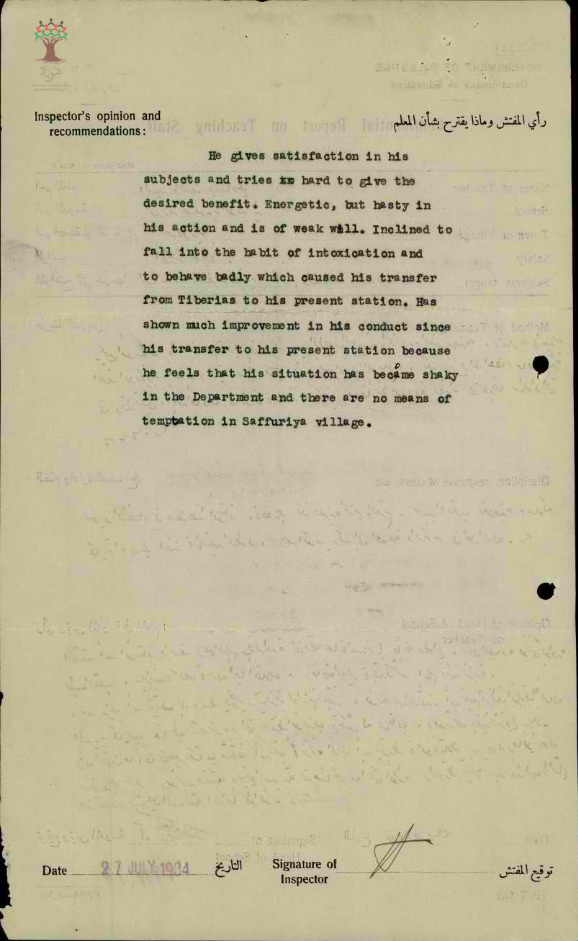 تقرير تفصيلي عن أداء المعلم واصف عنبتاوي في مدرسة صفورية للذكور سنة 1934