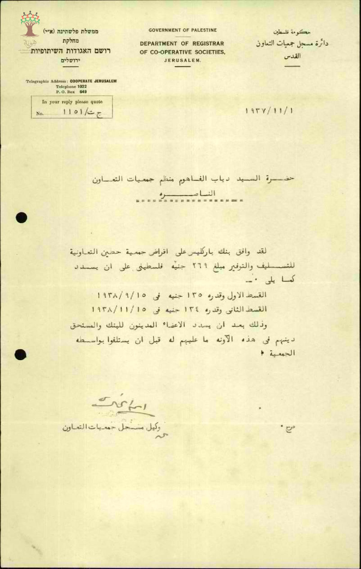 موافقة بنك باركليس على إقراض جمعية حطين التعاونية للتسليف 269 جنيه عام 1938 على أن تسدد على قسطين