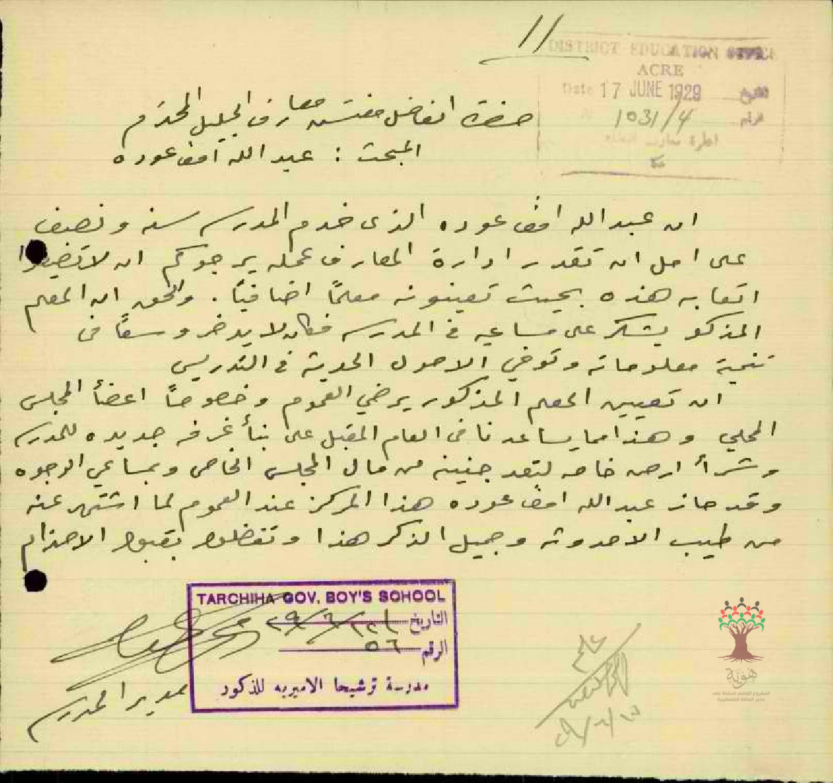 رسالة من مدير مدرسة ترشيحا الى مفتش المعارف لتعيين المعلم عبد الله عودة كمعلم اضافي