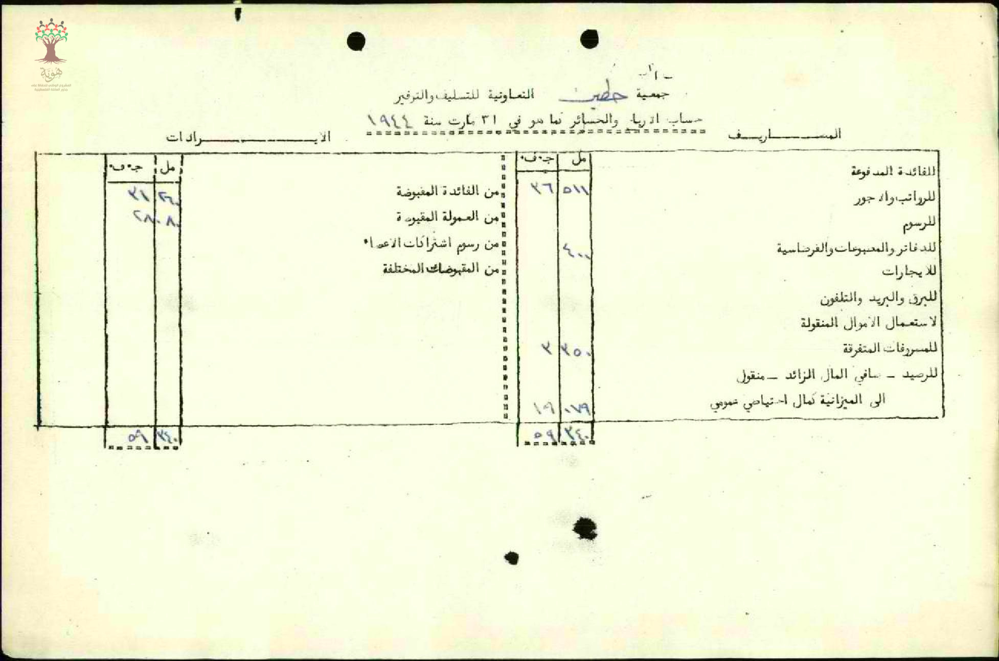 حساب الأرباح والخسائر لجمعية حطين التعاونة للتسليف والتوفير 31/3/1944