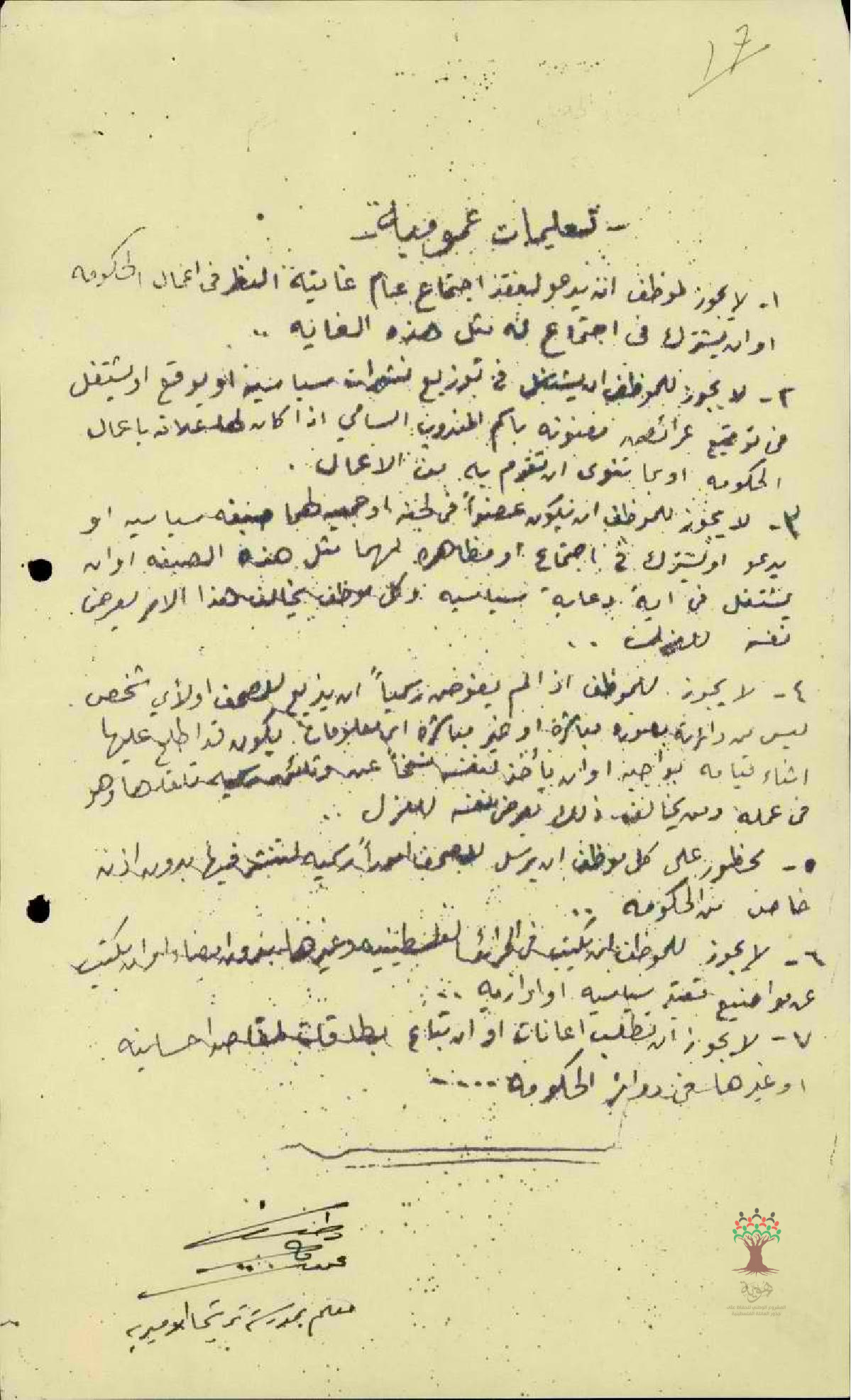 توقيع المعلم عبد الله عودة على التعليمات العمومية لإدارة المعارف