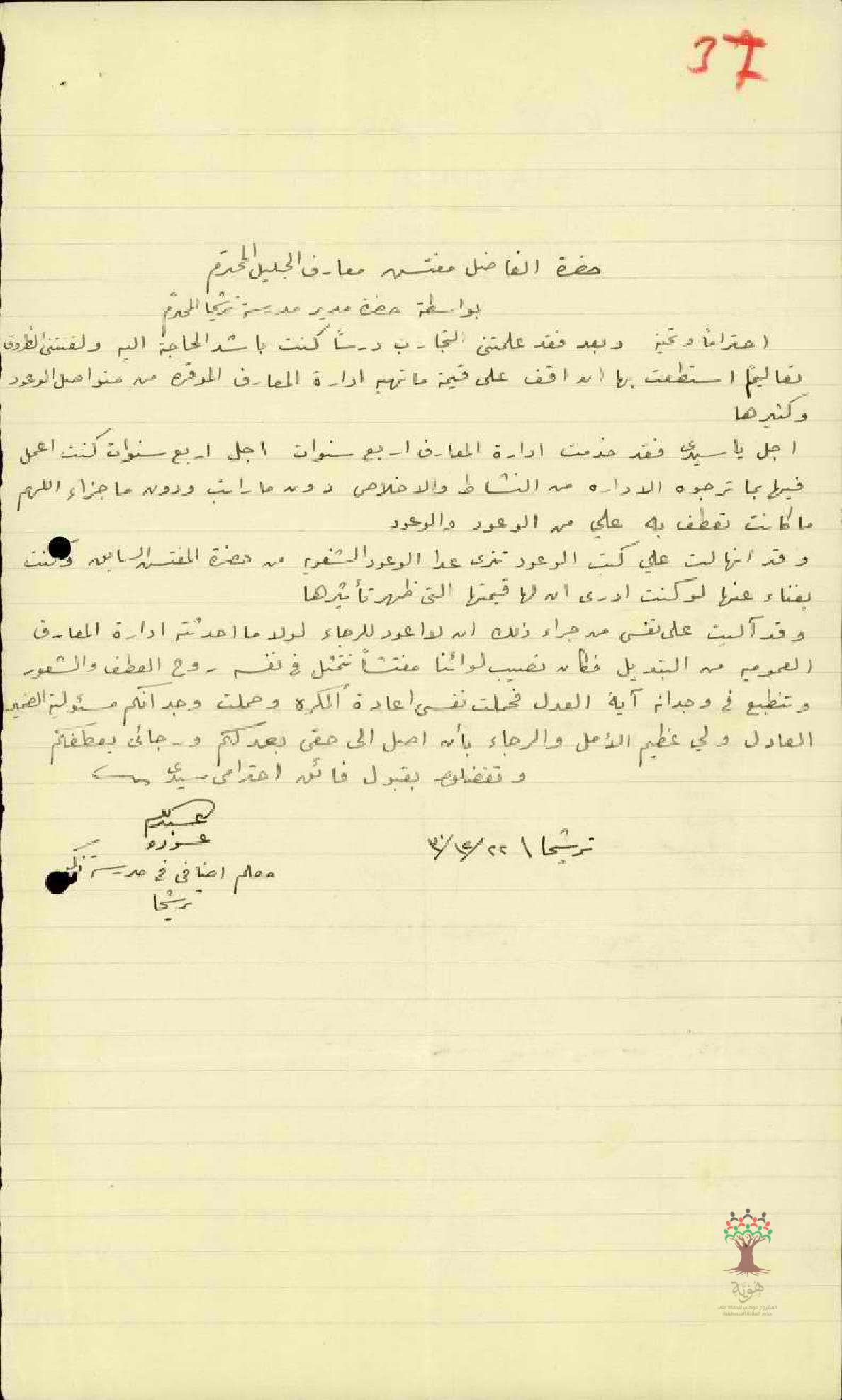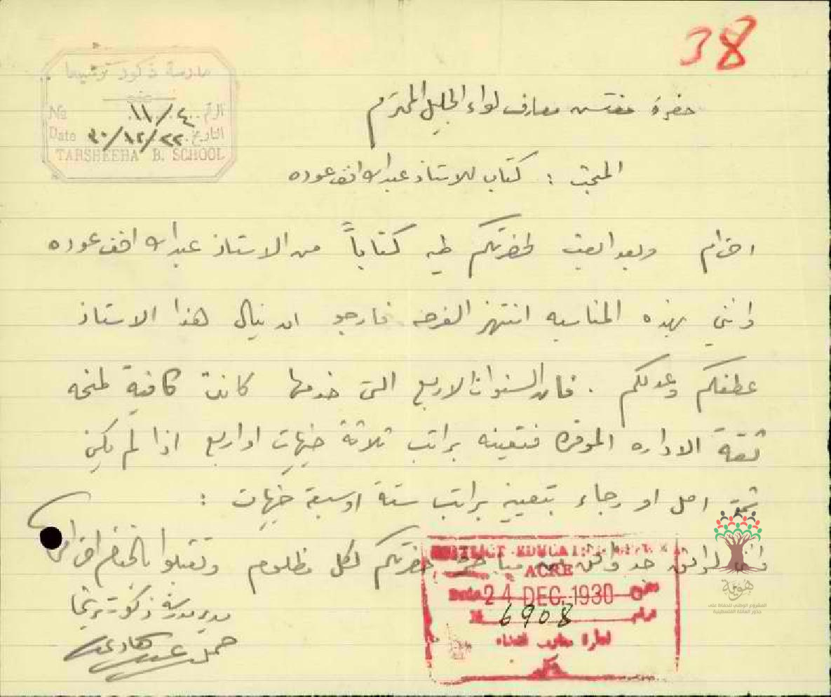 رسالة من مدير مدرسة ترشيحا مرفقة برسالة من المعلم عبد الله عودة بخصوص تحسين راتبه بعد خدمة اربع سنين في دائرة المعارف