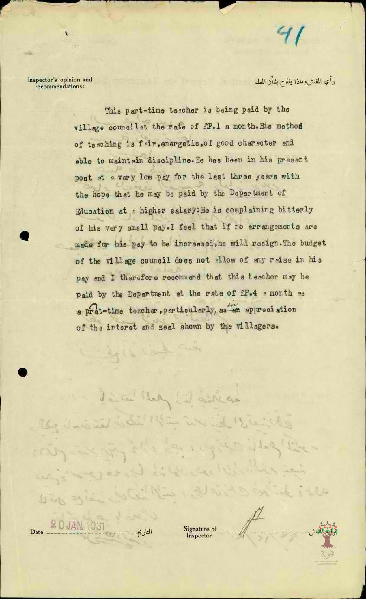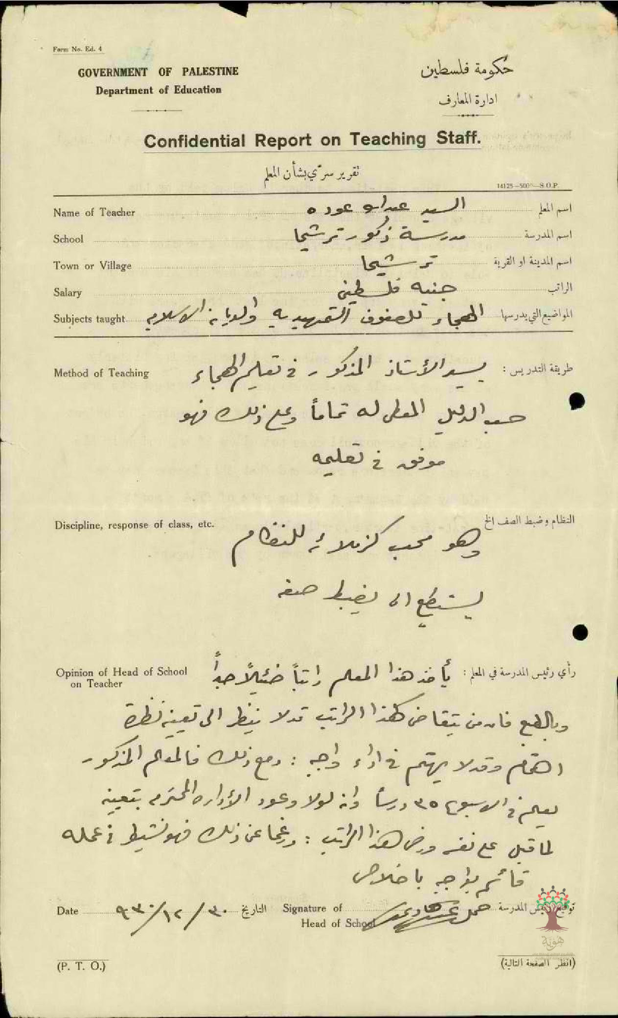 تقرير تفصيلي عن أداء المعلم عبد الله عودة في مدرسة ترشيحا للذكور سنة 1930