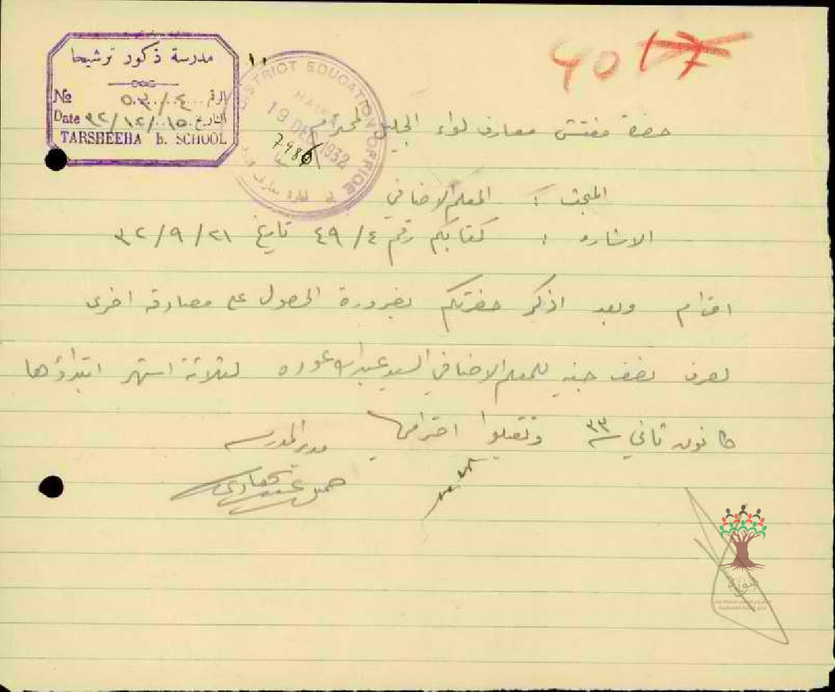 رسالة من مدير مدرسة ترشيحا الى مفتش المعارف ليذكره بضرورة المصادقة على صرف نصف جنيه للمعلم عبد الله عودة