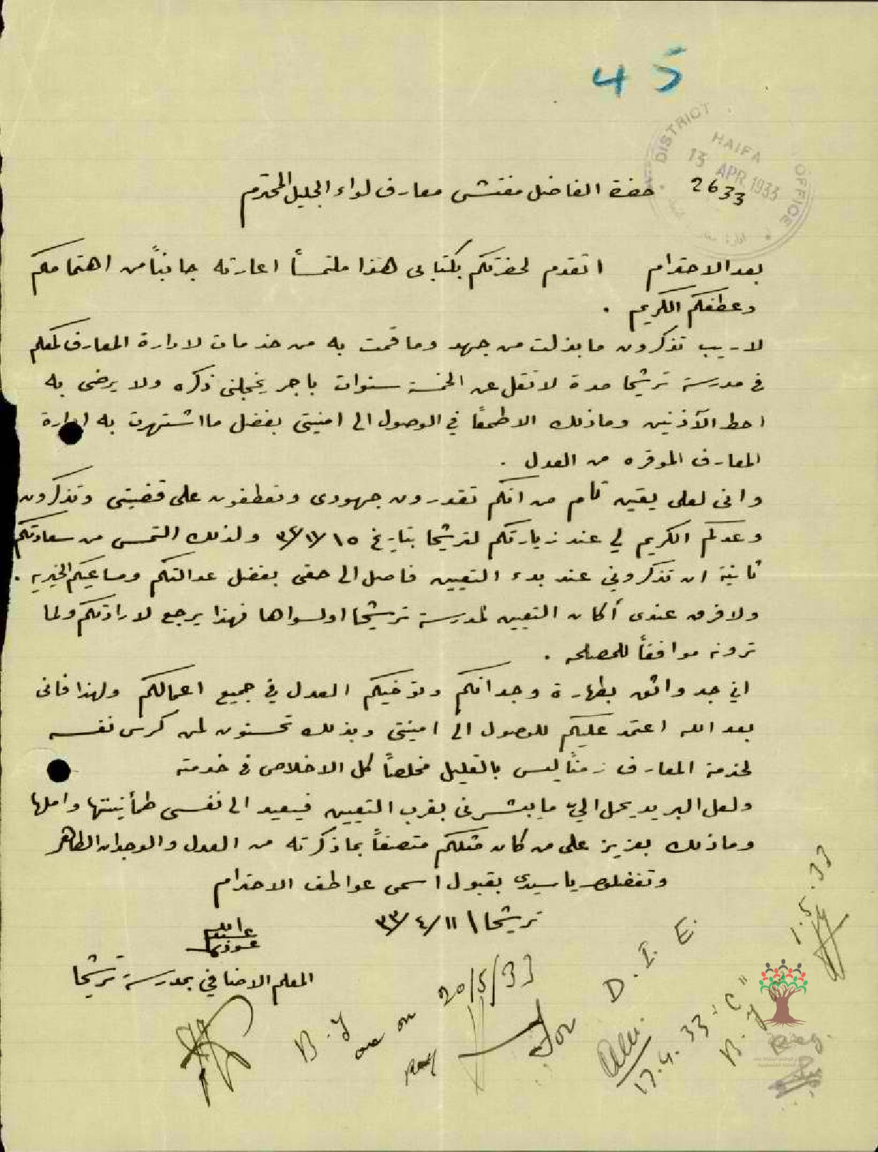 رسالة من المعلم عبد الله عودة الى مفتش المعارف يطلب فيها تعيينه بشكل رسمي