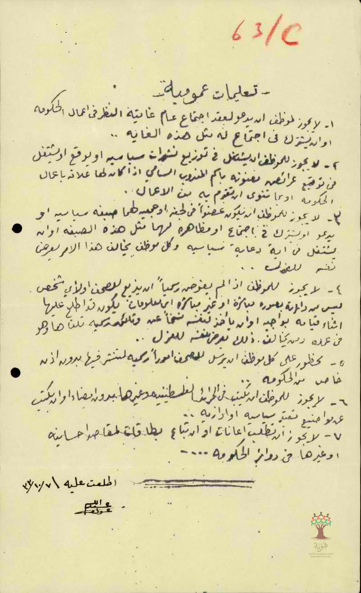 توقيع المعلم عبد الله عودة على التعليمات العمومية لإدارة المعارف