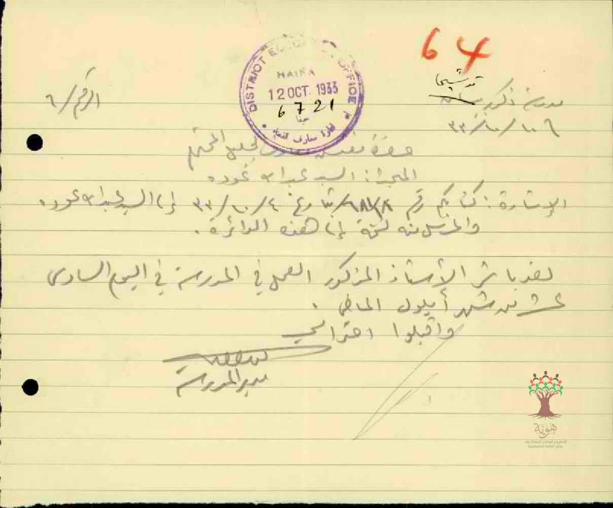 رسالة من مدير مدرسة ترشيحا الى مفتش المعارف يخبره بأن المعلم عبد الله عودة قد باشر عمله