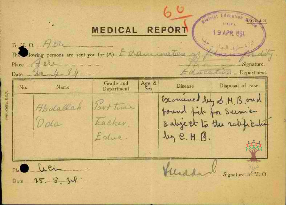 تقرير طبي عن غياب المعلم عبد الله عودة-مدرسة ترشيحا