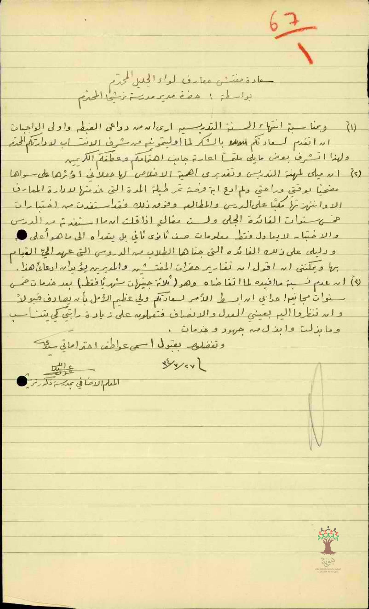 رسالة من المعلم عبد الله عودة الى مفتش المعارف يطلب فيها تحسين راتبه