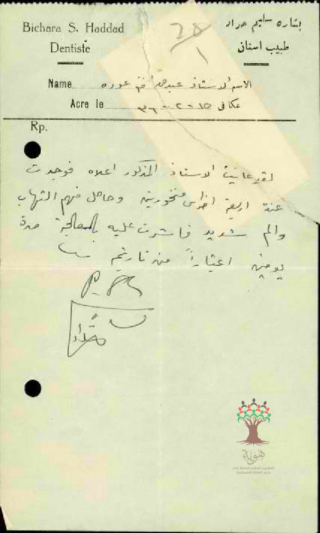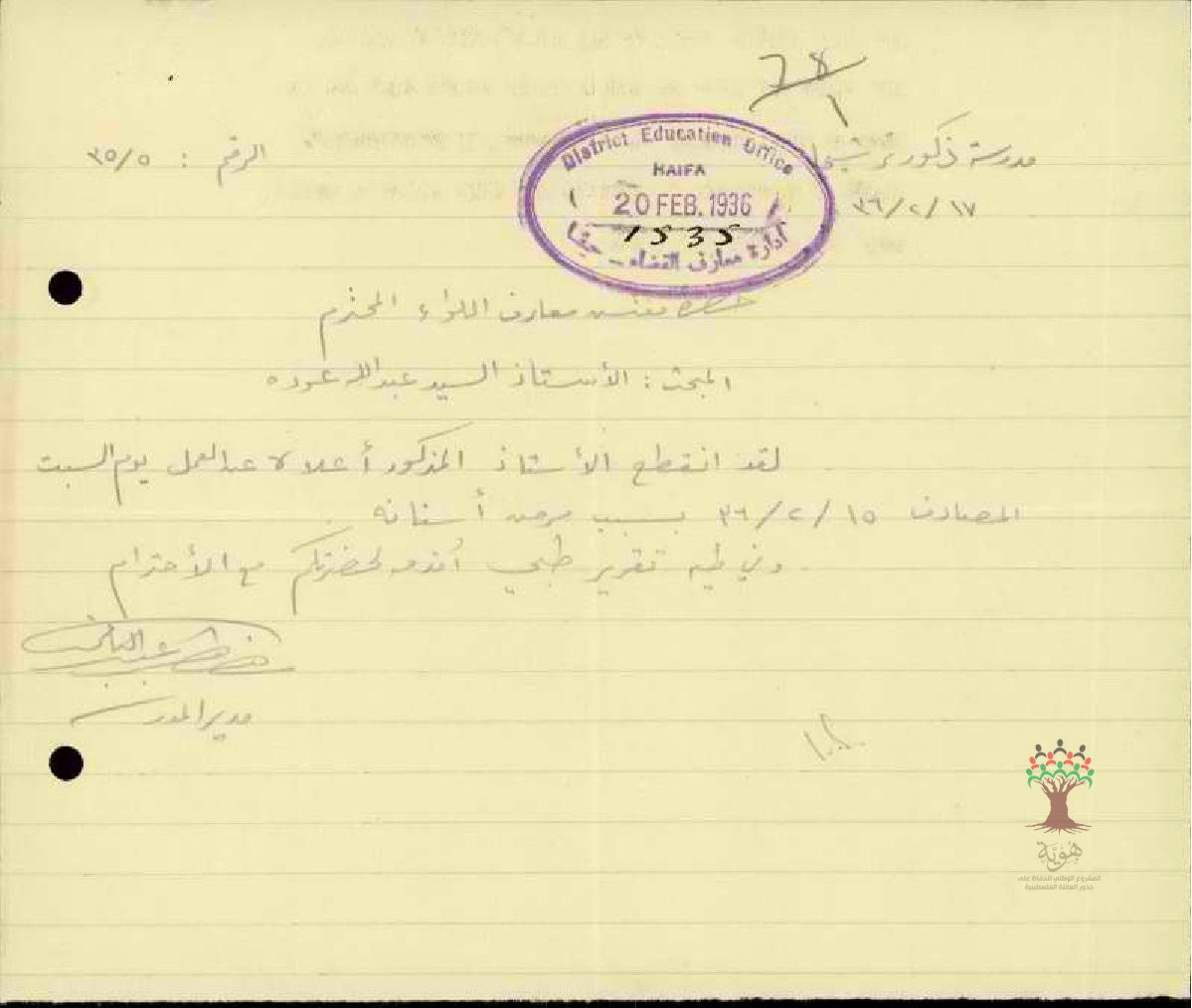 رسالة من مدير مدرسة ترشيحا الى مفتش المعارف بخصوص تغيب المعلم عبد الله عودة بسبب المرض مرفقة بتقرير طبي