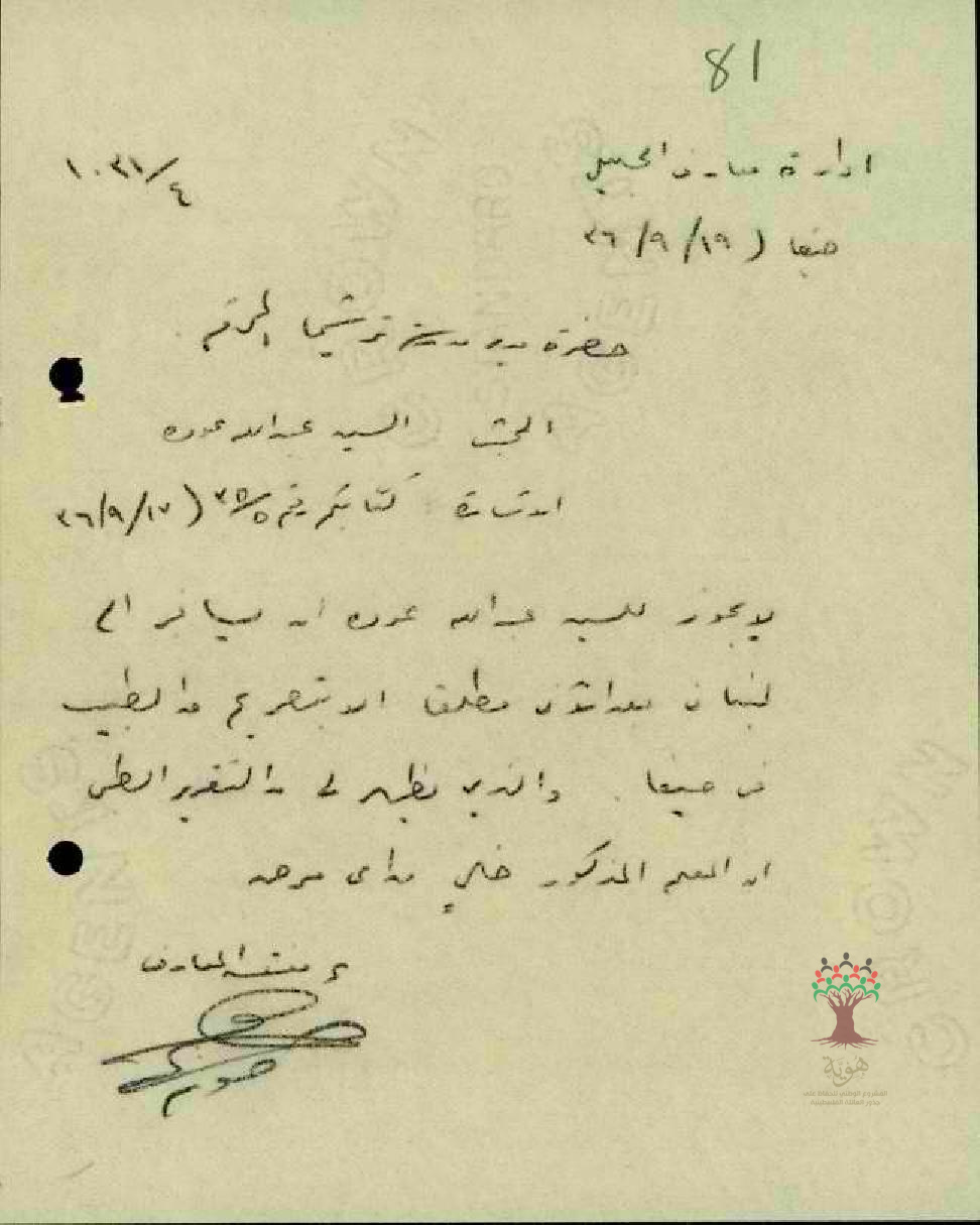 رسالة من مفتش المعارف الى مدير مدرسة ترشيحا بخصوص سفر المعلم عبد الله عودة الى لبنان