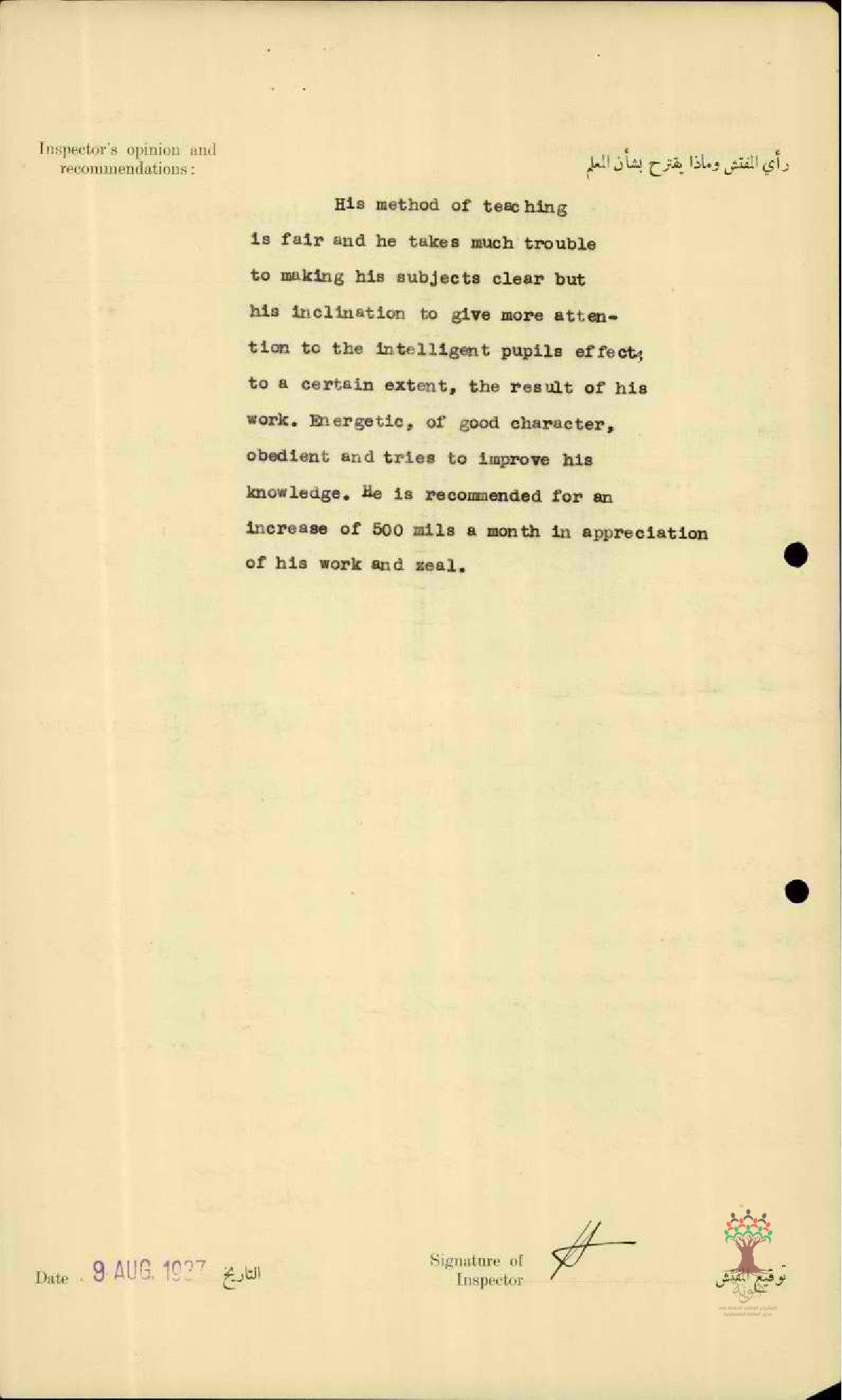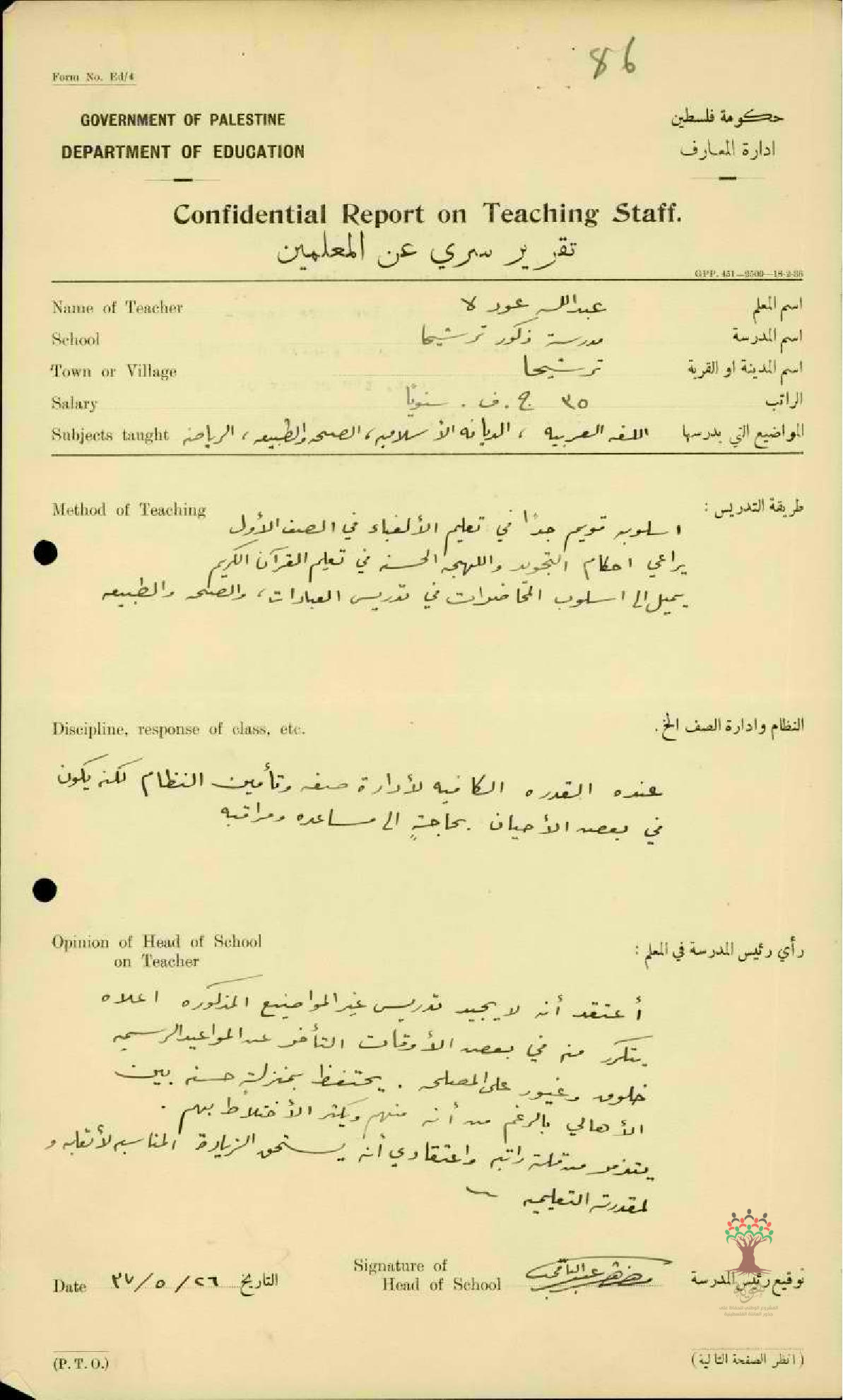 تقرير تفصيلي عن أداء المعلم عبد الله عودة في مدرسة ترشيحا للذكور سنة 1937